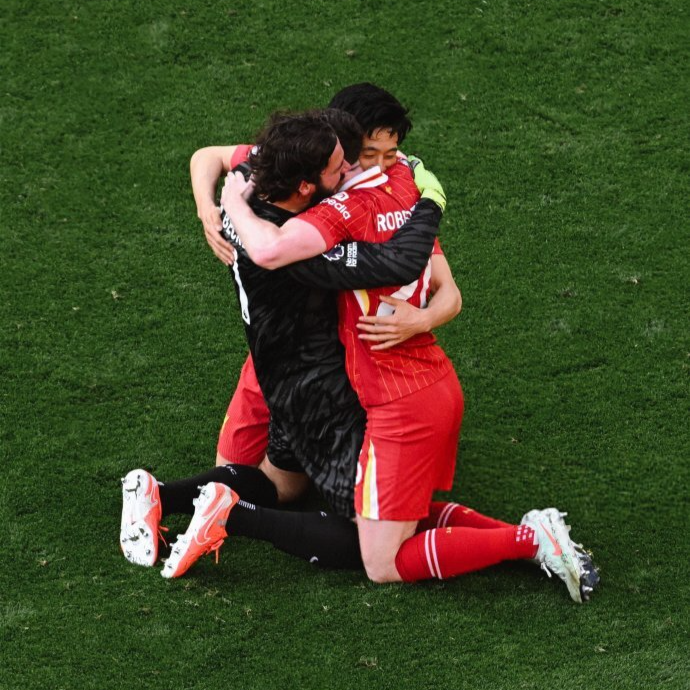 当终场哨响后,安菲尔德球场陷入沸腾。远藤航也第一时间激动与队友、巴西国门阿利松和苏格兰队长罗伯逊紧紧相拥。赛后,远藤航也与队友都换上了利物浦“20冠”的特制球衣,在安菲尔德球场高唱“你永不独行”的队歌,并且绕场庆祝,享受数万球迷的顶礼膜拜。
